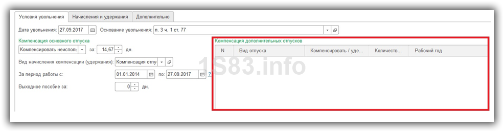 В некоторых случаях сотрудникам положены дополнительные отпуска. При увольнении за них так же нужно выплачивать компенсацию. Эти данные вносятся в соответствующую табличную част справа от данных о компенсации основного отпуска.