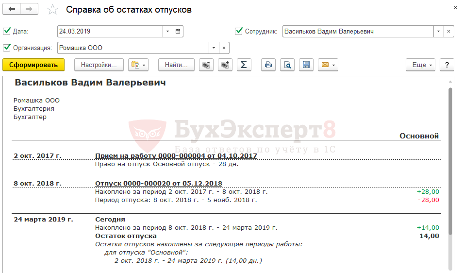 Сформируем Справку об остатках отпусков в разделе Кадры – Кадровые отчеты –Справка по остаткам отпусков, чтобы проверить сколько дней отпуска заработал сотрудник на предполагаемую дату увольнения.