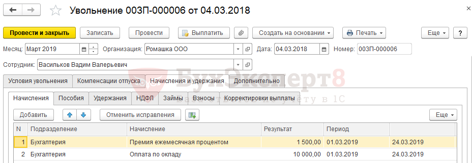 В открывшемся документе выбираем месяц, организацию, сотрудника и переходим к заполнению первой закладки Условия увольнения. При заполнении даты увольнения программа автоматически делает расчет и главное отличие от документа в программе предыдущей редакции в том, что одним документом начисляется и компенсация за отпуск и зарплата за отработанную часть месяца и НДФЛ и взносы и т.д. Т.е. все для чего раньше нам надо было использовать три документам, теперь делается одним! И это очень удобно. Помните, раньше приходилось контролировать НДФЛ, не забыть начислить страховые взносы, чтобы заполнялись справки для сотрудника и много всякой мороки.