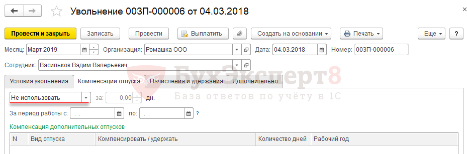 На вкладке Компенсация отпуска установилось значение Не использовать, поскольку сотрудник использовал все положенные дни отпуска:
