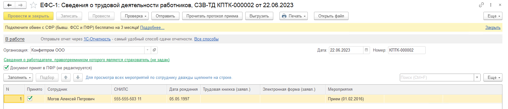 В случае приема сотрудника на работу сведения передаются в СФР не позднее рабочего дня, следующего за изданием соответствующего приказа (распоряжения или иных документов, подтверждающих оформление).