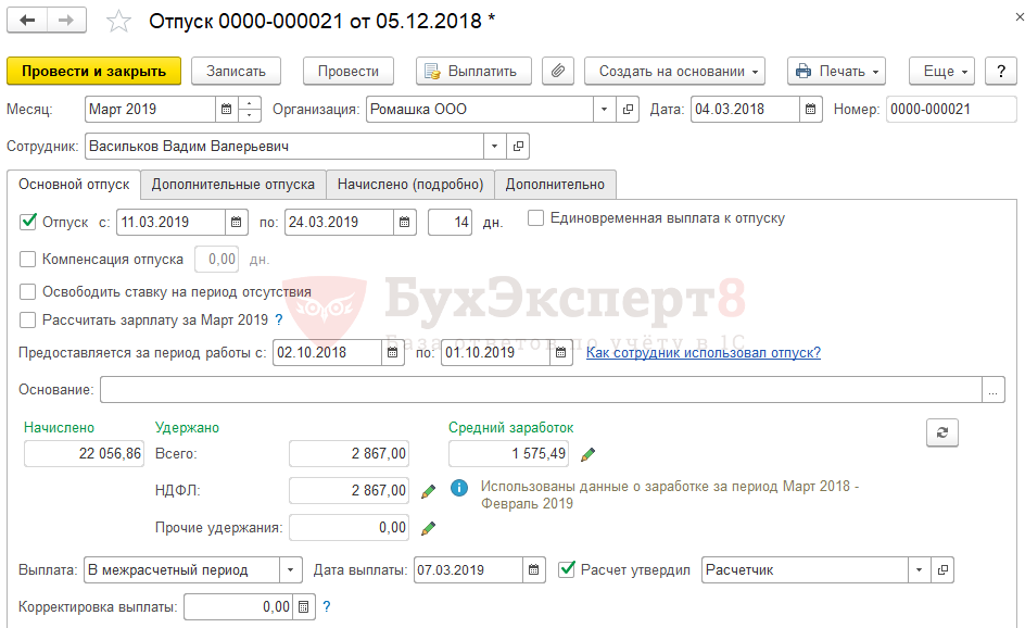 Рассмотрим оформление отпуска с последующим увольнением в 1С ЗУП 3 на примере.