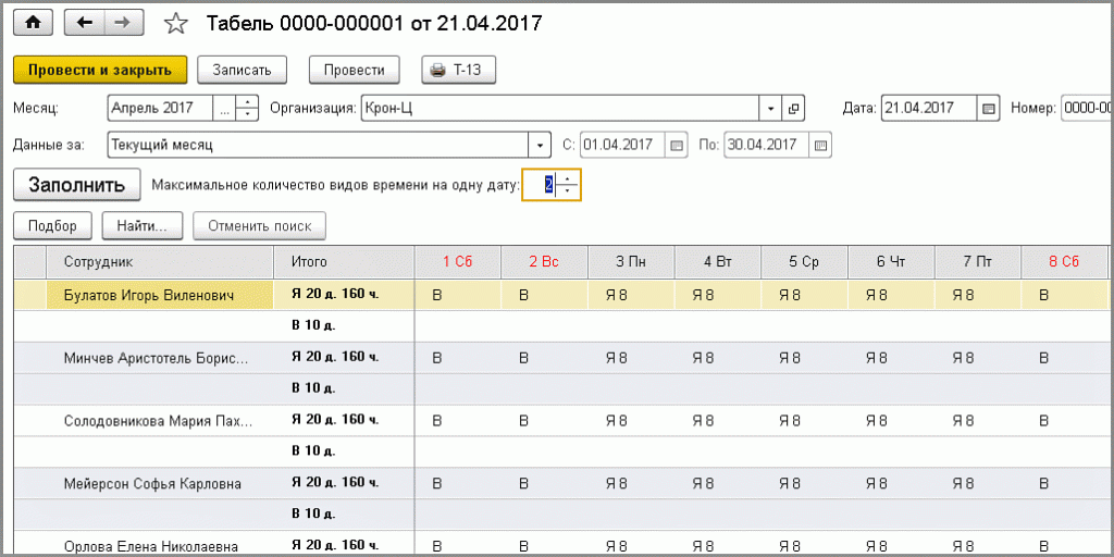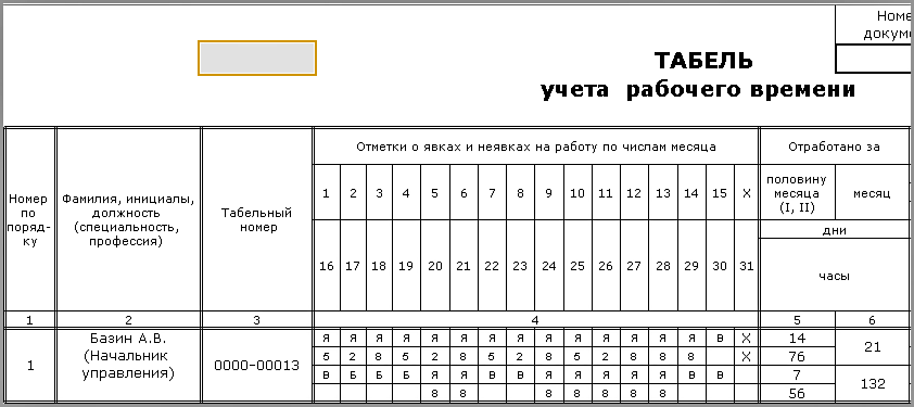 Рис. 4. Отчет «Табель учета рабочего времени Т-13»