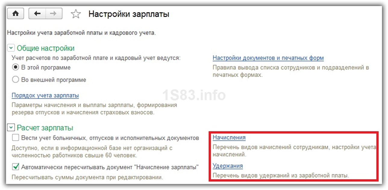 При необходимости вы так же можете настроить перечень начислений и удержаний по заработной плате. Вернитесь на форму настройки зарплаты и в разделе «Расчет зарплаты» выберите соответствующий пункт. Как правило, в типовой поставке конфигурации там уже будут данные.