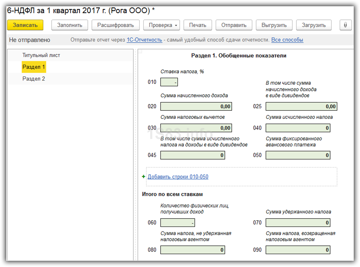 В разделе 1 указываются обобщенные по всем физическим лицам суммы начисленного дохода, исчисленного и удержанного налога нарастающим итогом с начала налогового периода по соответствующей налоговой ставке.