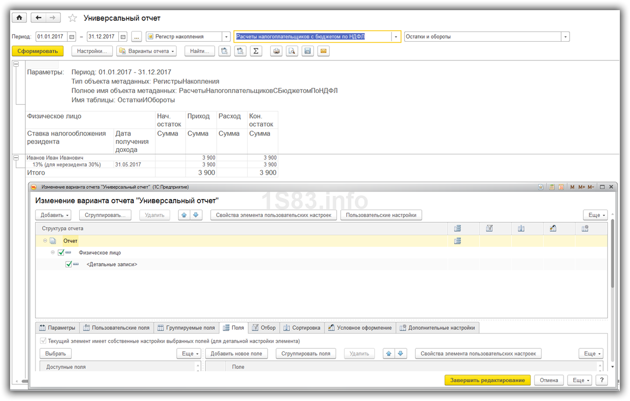 Если начисленный и удержанный НДФЛ в 1С 8.3 не совпадает, можно найти ошибки универсальным отчетом. В шапке выберите регистр «Расчеты налогоплательщиков с бюджетом по НДФЛ» и укажите, что его формирование будет производиться по остаткам и оборотам.