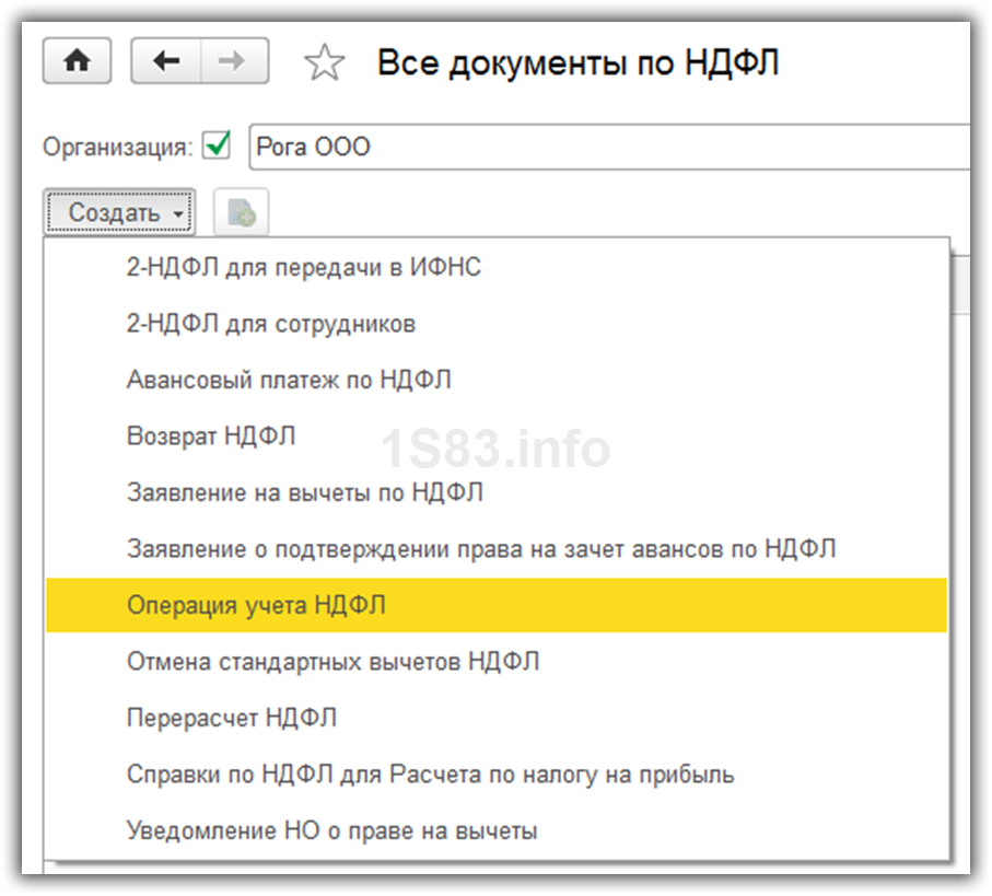 В меню «Зарплата и кадры» выберите пункт «Все документы по НДФЛ». В открывшейся форме списка создайте новый документ с видом операции «Операция учета НДФЛ».