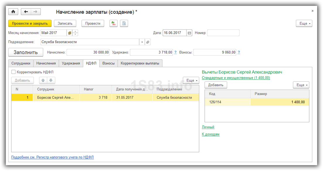 Рассмотрим НДФЛ в документе «Начисление зарплаты». Он находится на одноименной вкладке данного документа. Так же здесь применяются вычеты. После проведения эти данные попадают в проводки.