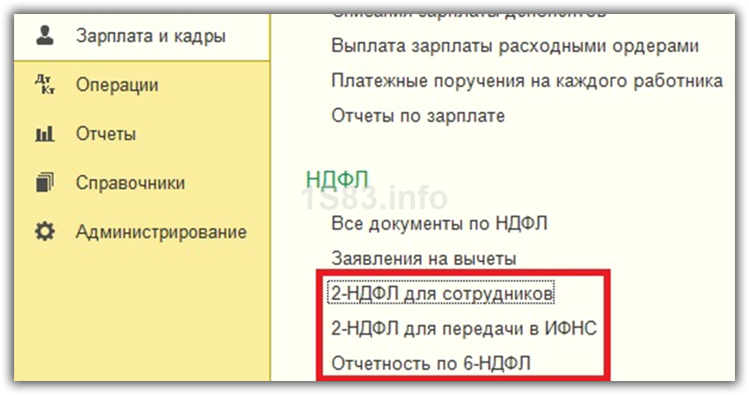 Самыми часто используемыми отчетными документами по НДФЛ являются: «2-НДФЛ» и «6-НДФЛ». Они находятся в меню «Зарплата и кадры».
