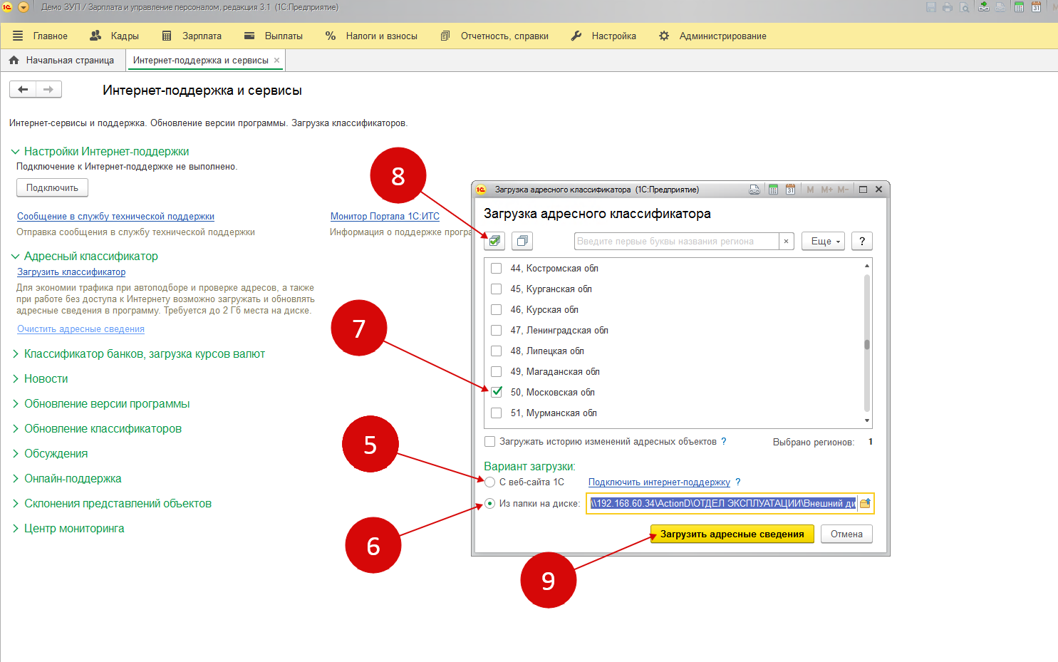 - Выбрать «Загрузить адресные сведения» (9). После этого начнется загрузка адресных классификаторов по выбранным населенным пунктам;
