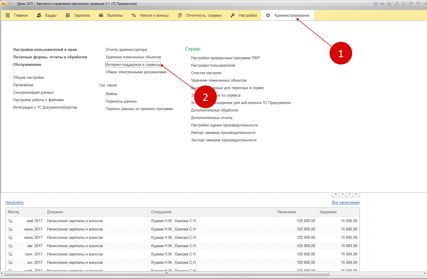 - Нажать «Интернет-поддержка и сервисы» (2), после чего откроется вкладка с набором сервисов 1С;