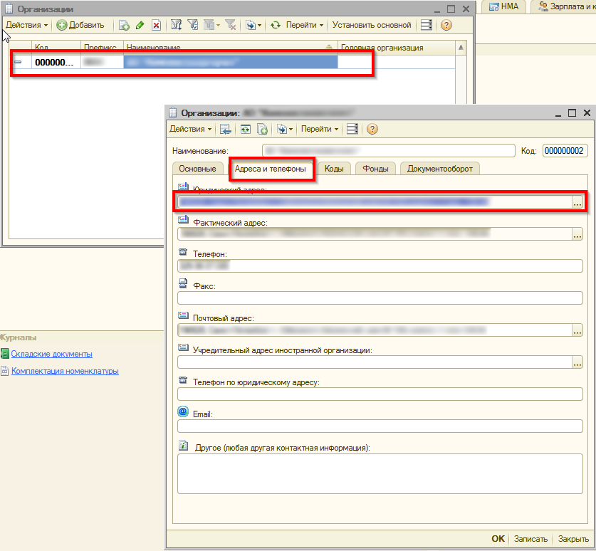 3. Выбираем ЛЮБУЮ организацию, переходим на вкладку «Адреса и телефоны», выбираем любой адрес, нажимаем 3 точки. Это не единственный путь для выбора. Можно сделать загрузку, через любого контрагента, либо, через пункт меню «Операции» открыть регистр сведений «Адресный классификатор»