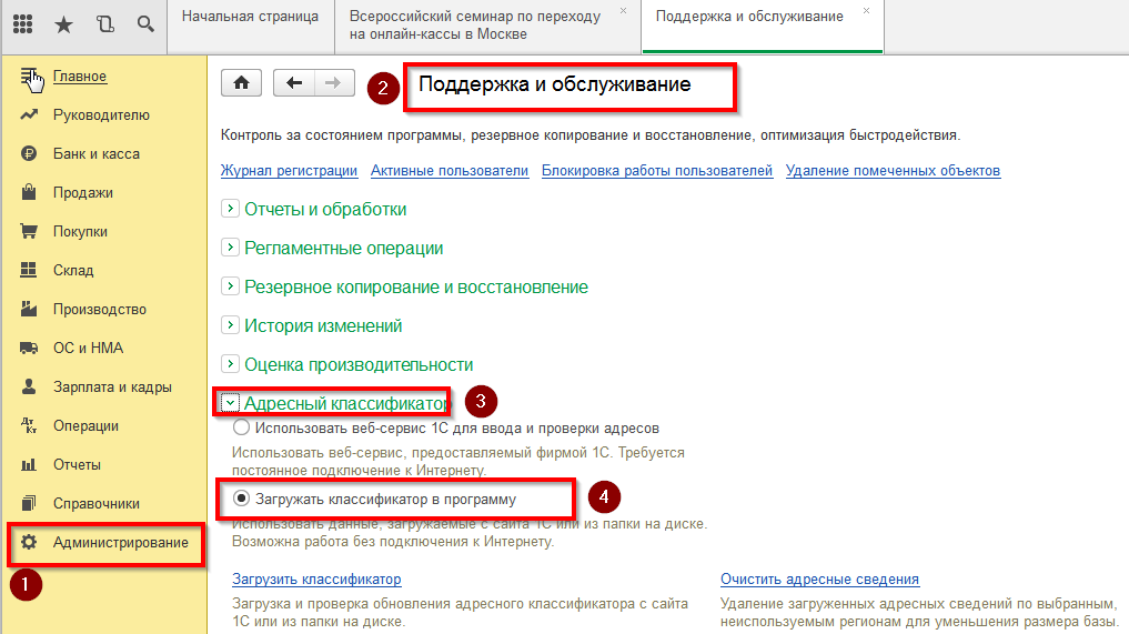1. Выбираем пункт меню «Администрирование», в нём «Поддержка и обслуживание», далее «Адресный классификатор». В настройках можно автоматическую проверку адресов через веб — сервис 1с, это удобно, при наличии интернета или загрузку адресного классификатора в программу: