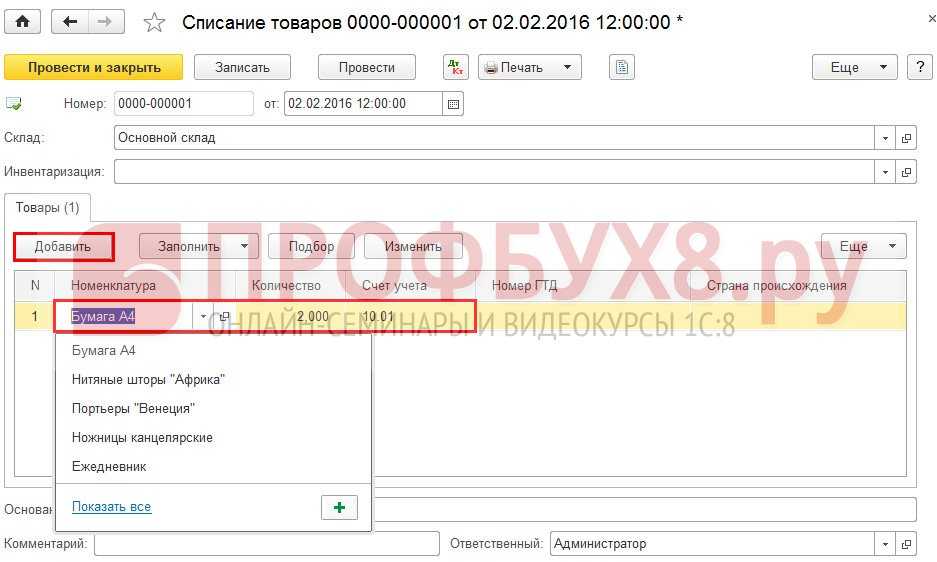 По кнопке Добавить вводим наименование списываемого материала и его количество в таблицу Товары. Счет учета материала заполняется автоматически счетом, указанным в карточке номенклатуры: