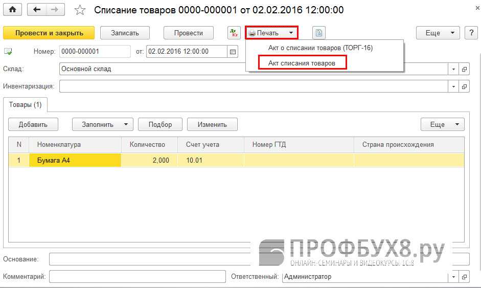 Шаг 5. Просмотр печатных форм документа Списание товаров