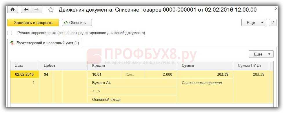 Документ делает проводки по Дт счета 94 и Кт счета учета (столбец Счет учета таблицы Товары). Проводки можно посмотреть по кнопке :