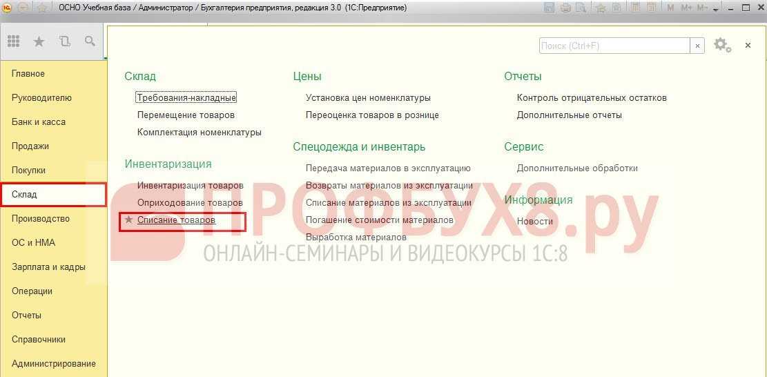 Выбираем раздел Склад – Инвентаризация – Списание товаров: