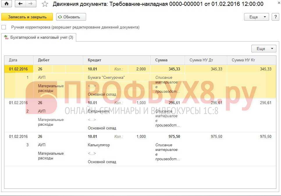 Давайте установим время документа «Требование-накладная» на конец дня и перепроведем. Заходим в проводки документа и видим, что произошло списание суммы номенклатуры.