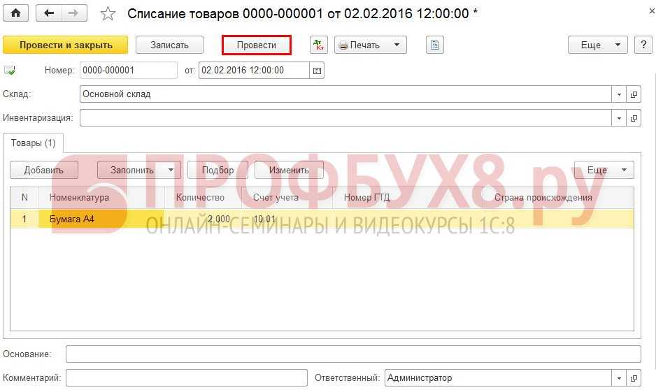 Но прежде всего хотелось бы обратить внимание на один важный нюанс для тех, кто следует нашему примеру: в программе могут быть установлены настройки, которые не позволяют производить списание материалов при их отсутствии на складе. И поэтому программа данный документ не проводит и выводит ошибки!. Однако возможен и другой вариант