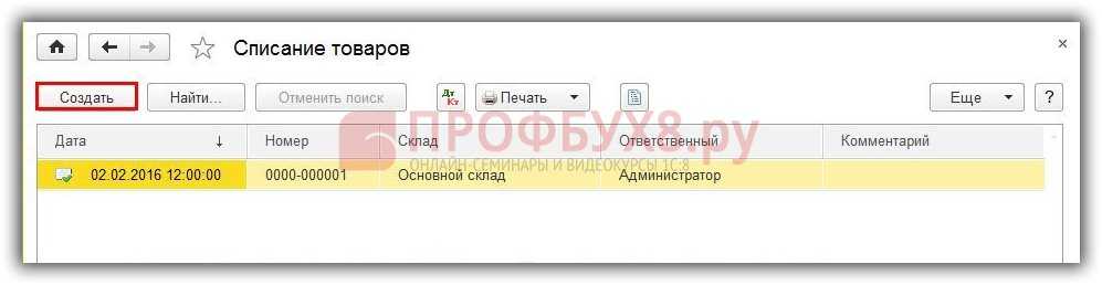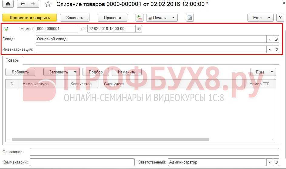 Шаг 2. Заполняем заголовок формы Списание товаров