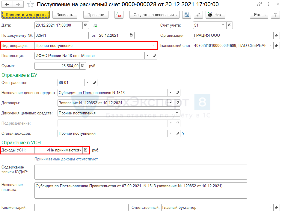 - Назначение целевых средств — создайте запись в справочнике Назначения целевых средств: например, Субсидия по Постановлению N 1513 (используется для внутренней аналитики);