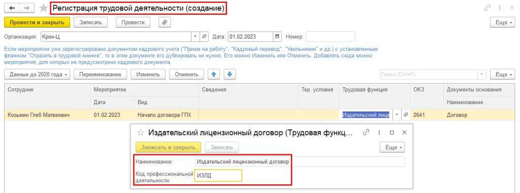 Трудовая функция для договоров ГПХ и авторского заказа добавлена в справочник Трудовые функции и подбирается автоматически в зависимости от созданного документа (рис. 2).