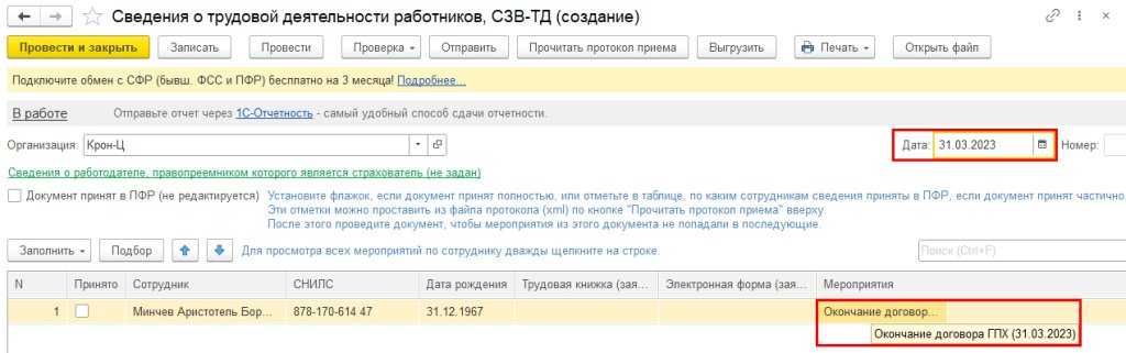 Рис. 4. Окончание договора ГПХ в сведениях на 31.03.2023 года в программе «1С:Зарплата и управление персоналом 8»