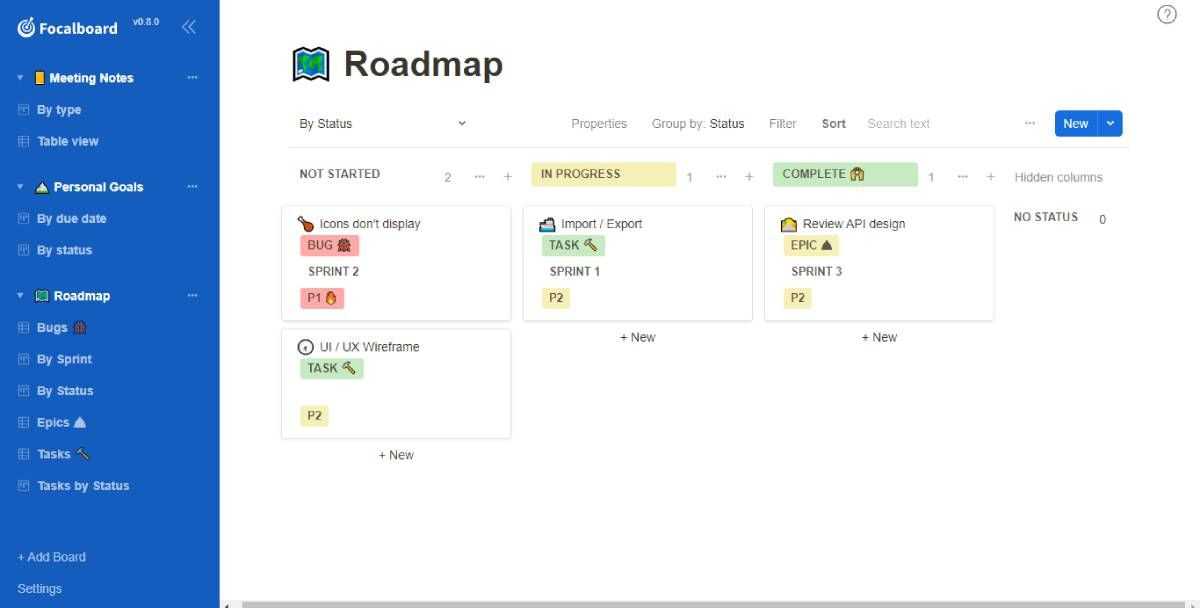 Приложение предлагает готовые шаблоны для заметок о собраниях, личных целей, личных задач, задач проекта и дорожных карт для разработчиков. В каждом из них есть общие столбцы, такие как специальные, резервные и еженедельные доски синхронизации в Заметках о собраниях. Вы можете создать столько «материнских досок канбан», сколько захотите, и все они будут отображаться на боковой панели.