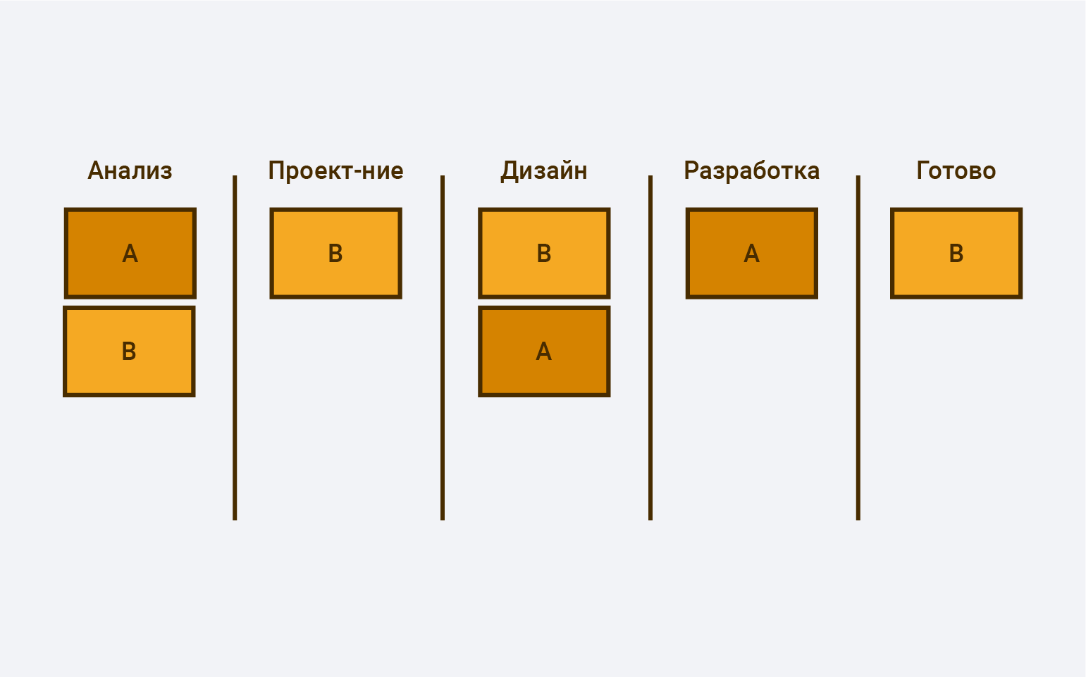 Сохранить допустимое количество карточек помогает еще один принцип. Для планирования работы в команде нет необходимости видеть этапы каждой активности.
