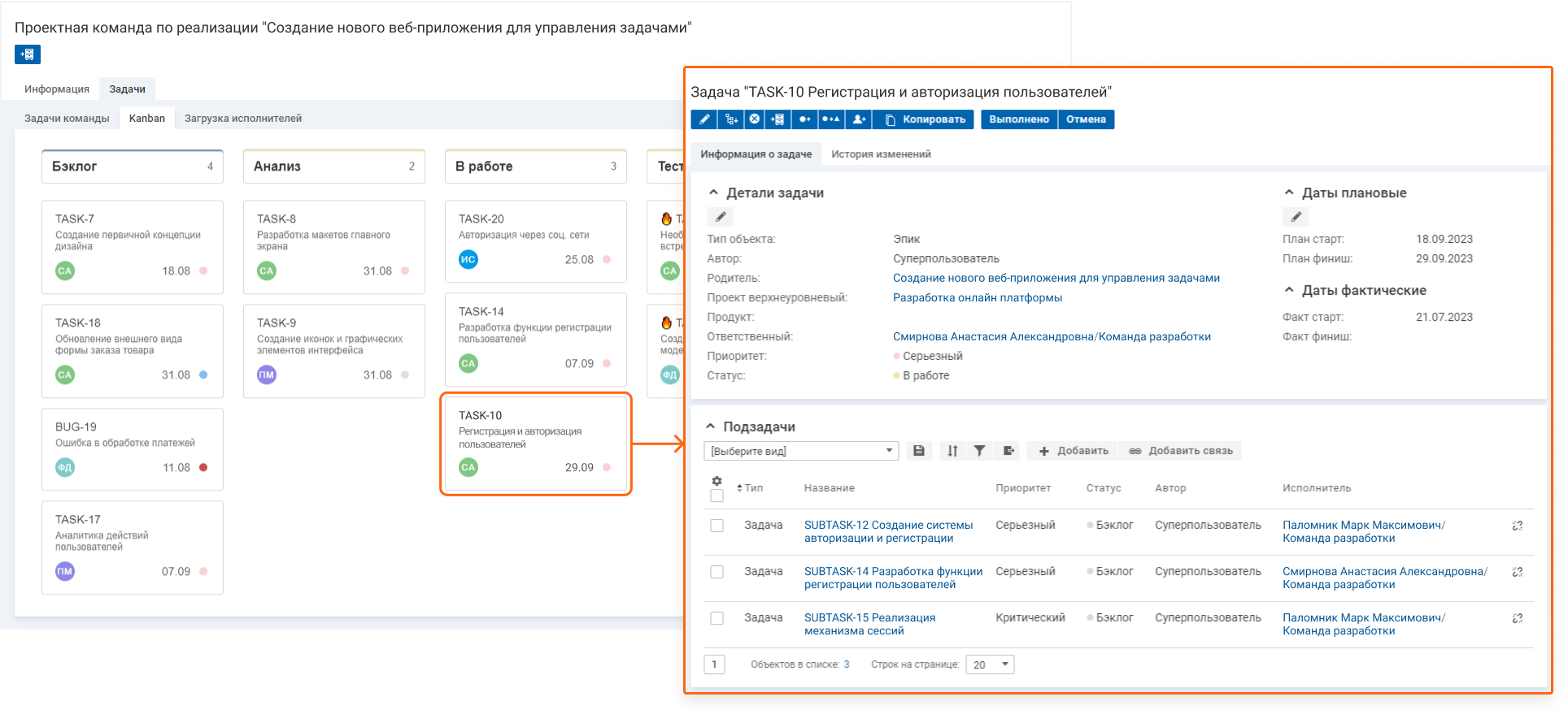 Отдельные этапы проведения работ исполнитель отслеживает в карточке задачи, а на командную доску они не выносятся