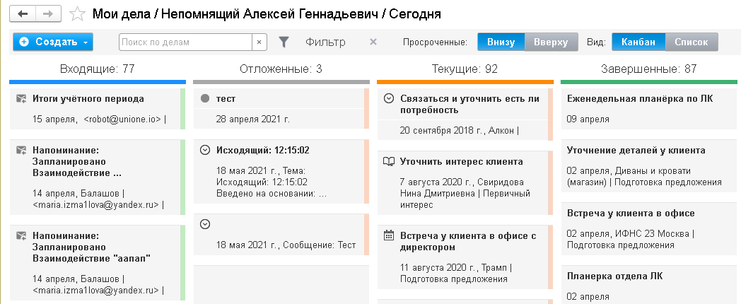 Пользователь, работая с колонкой Входящие, переносит дела в соответствующую колонку. При этом для обработки писем, сообщений чатов и звонков автоматически создается личная задача.
