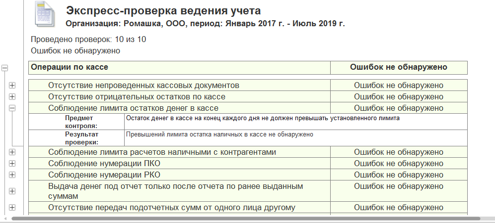 - «Операции по кассе». При такой проверке программа проверяет наличие отрицательных остатков в кассе (их не должно быть), превышение ежедневного лимита остатка наличных ДС в кассе, соблюдение нумерации ПКО и РКО, учет подотчетных ДС. Такие проверки позволяют соблюдать кассовую дисциплину.
