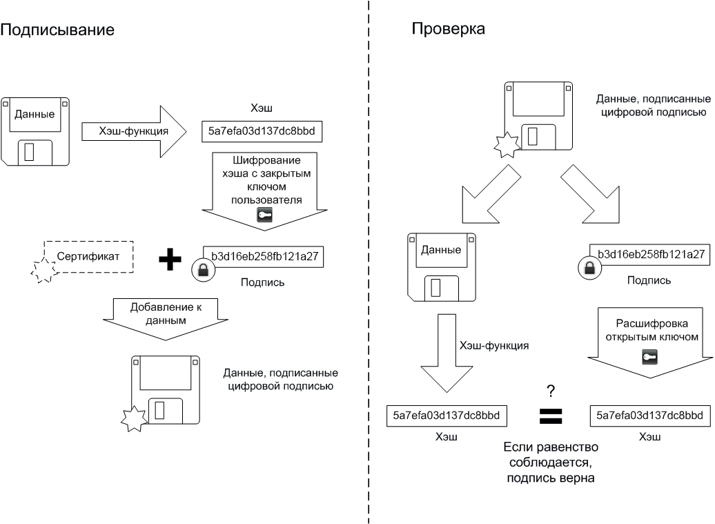 На рисунке ниже проиллюстрирован процесс подписания и идентификации подписи при асимметричном шифровании: