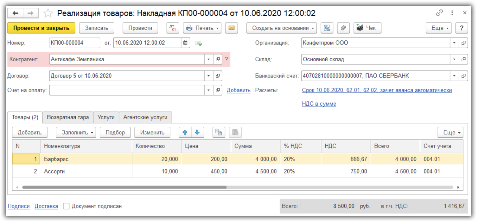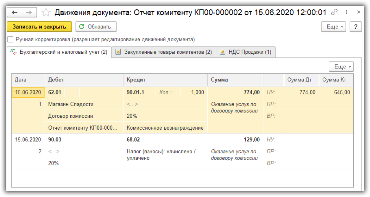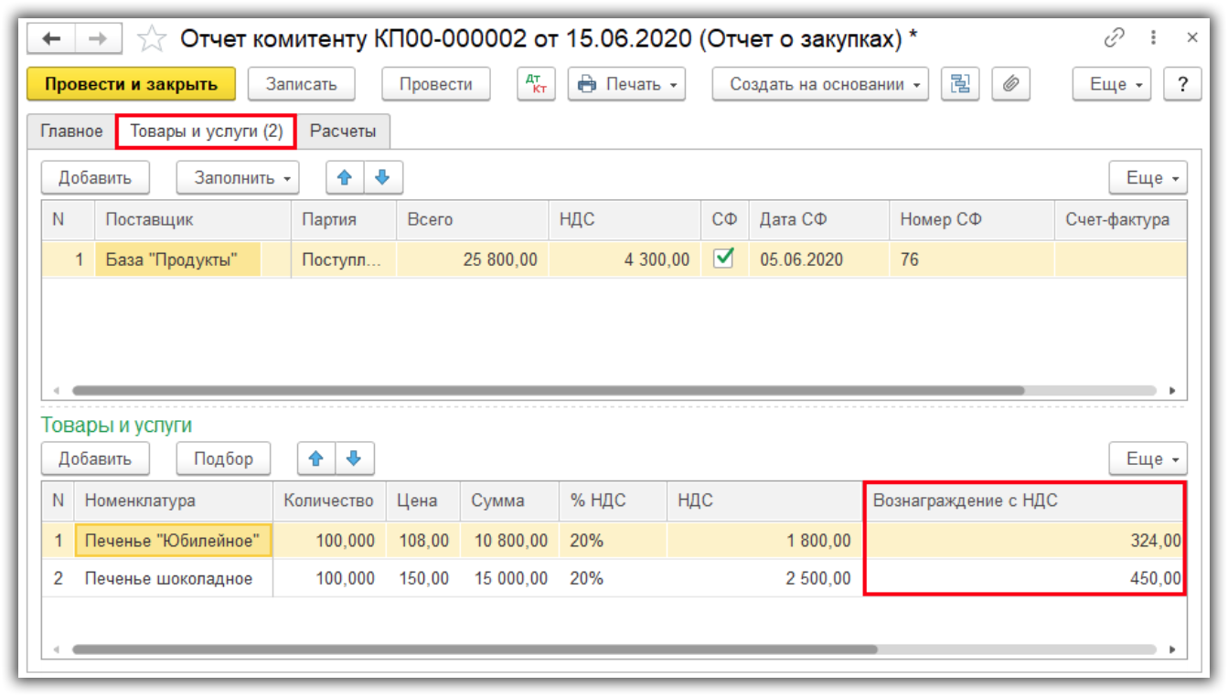 , как в отношении реализации комитента, так и в отношении комиссионного вознаграждения, рассчитываются автоматически согласно данным, заполненным на закладке формы документа Реализация