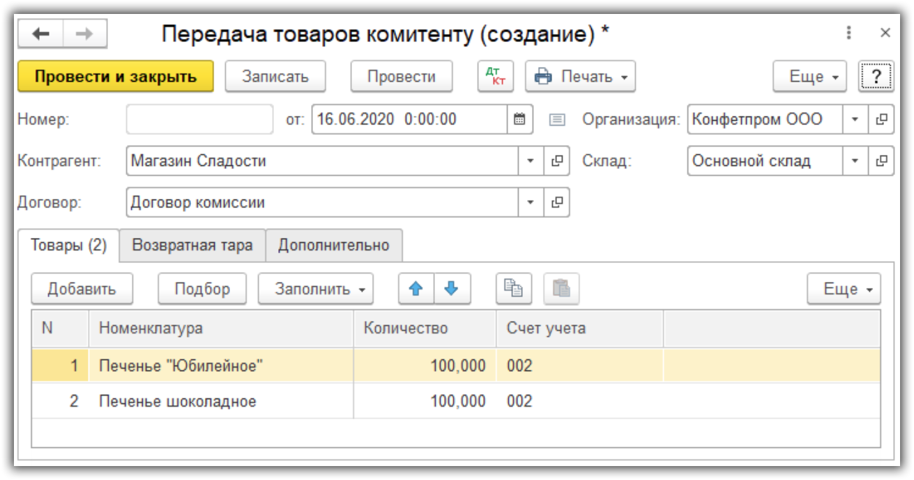 С учетом того, что товары передаются второй стороне на комиссию, в табличной части имеется графа «Счет передачи». Данный счет применяется для отражения всех товаров, передаваемых комиссионеру. Счет выставляется автоматически из номенклатуры. Если она выставлена в позицию «Товар», то счет берется 45.01 «Покупные товары отгруженные».