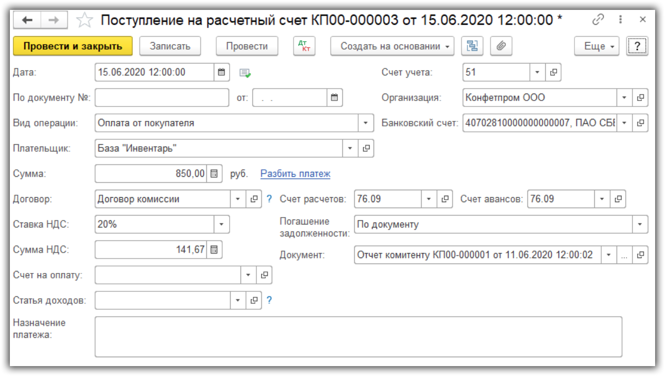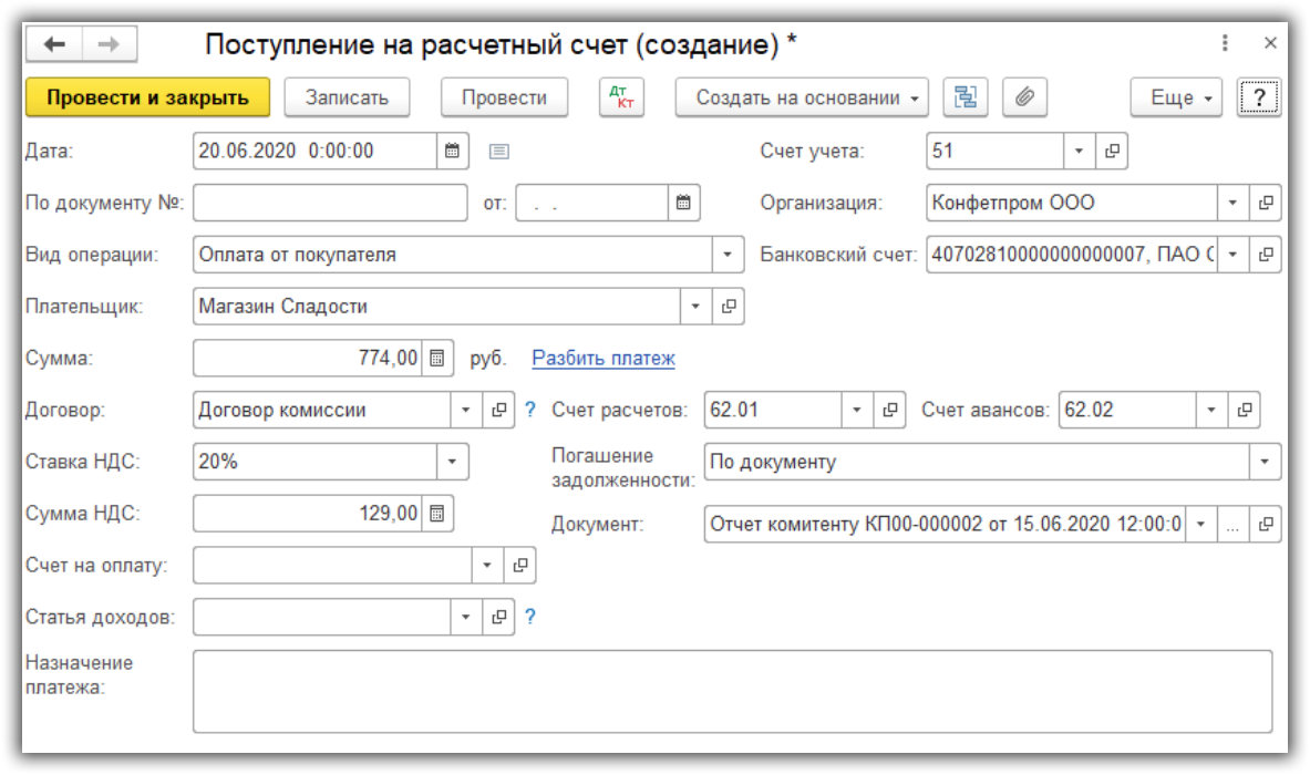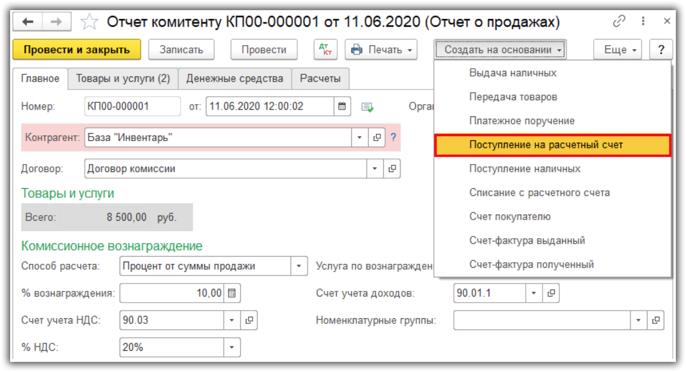 Этот этап используется, если в документе “Отчет комитенту” мы не устанавливали флажок “Удержать комиссионное вознаграждение с выручки комитента”. Тогда комитент перечисляет нам деньги и мы создаем документ “Поступление на расчетный счет”. Это можно сделать на основании отчета комитенту.