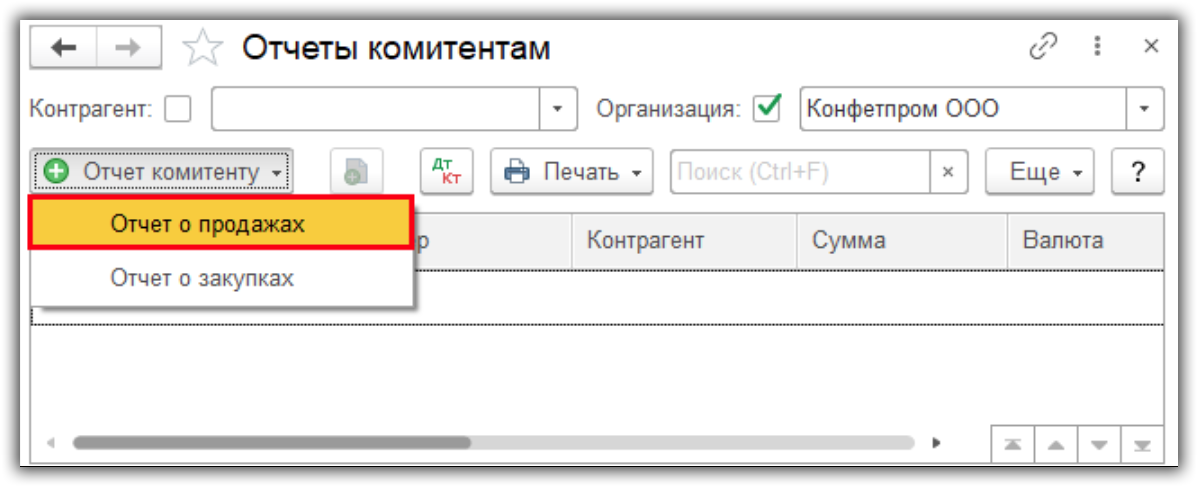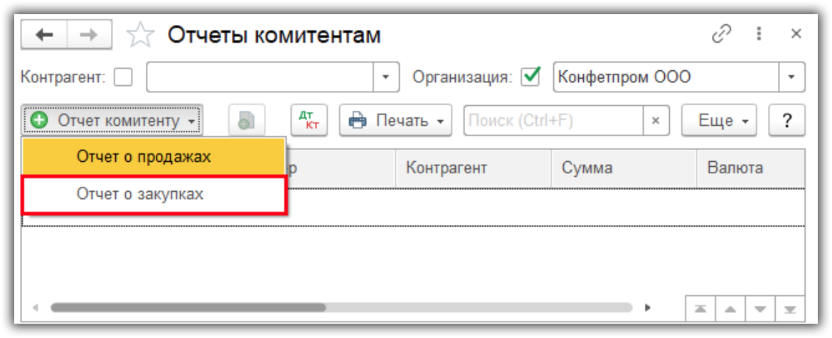 - В разделах «Покупки» — «Отчет комитенту».