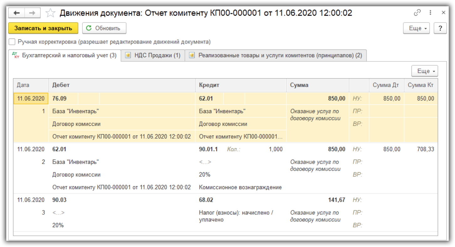 Нужно обязательно обращать внимание на проводки. Так как выручка от реализации продукции не имеет прямого отношения к доходу комиссионера, проводки по Кт 90.01.1 и списания себестоимости на Дт 90.02.1