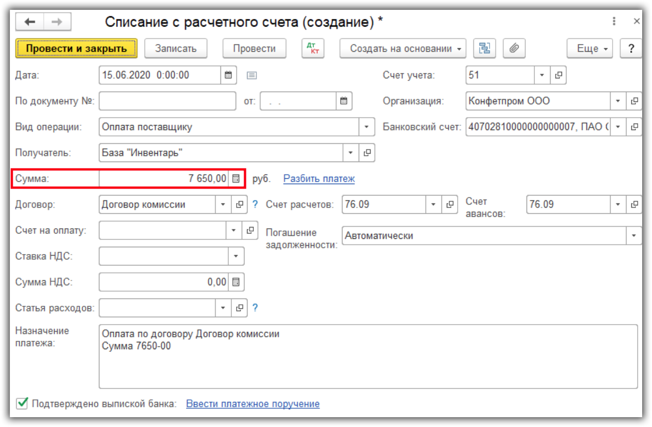 При этом сумма заполнится автоматически: либо вся сумма, либо за вычетом комиссии в зависимости от флажка на закладке “Расчеты” в документе “Отчет комитенту”.