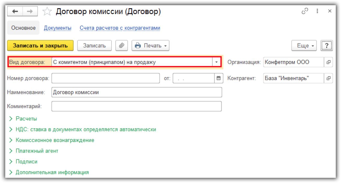Ключевые реквизиты, влияющие на правильность отражения операции, — вид формируемой номенклатуры и договор. В договоре обязательно указывается вид «С комитентом на продажу». Во вкладке «Комиссионное вознаграждение» выбирается способ расчета. В примере ниже рассматривается процесс заполнения договора с вознаграждением процентами от суммы продаж.