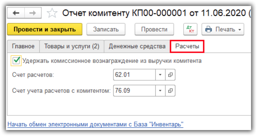 - На закладке “Расчеты” проверим счета расчетов. Также здесь есть флажок «Удержать комиссионное вознаграждение из выручки комитента». Если флажок установлен, то мы заплатим комитенту меньше денег, часть оставим себе. Иначе перечислим деньги полностью, а контрагент потом нам заплатит.