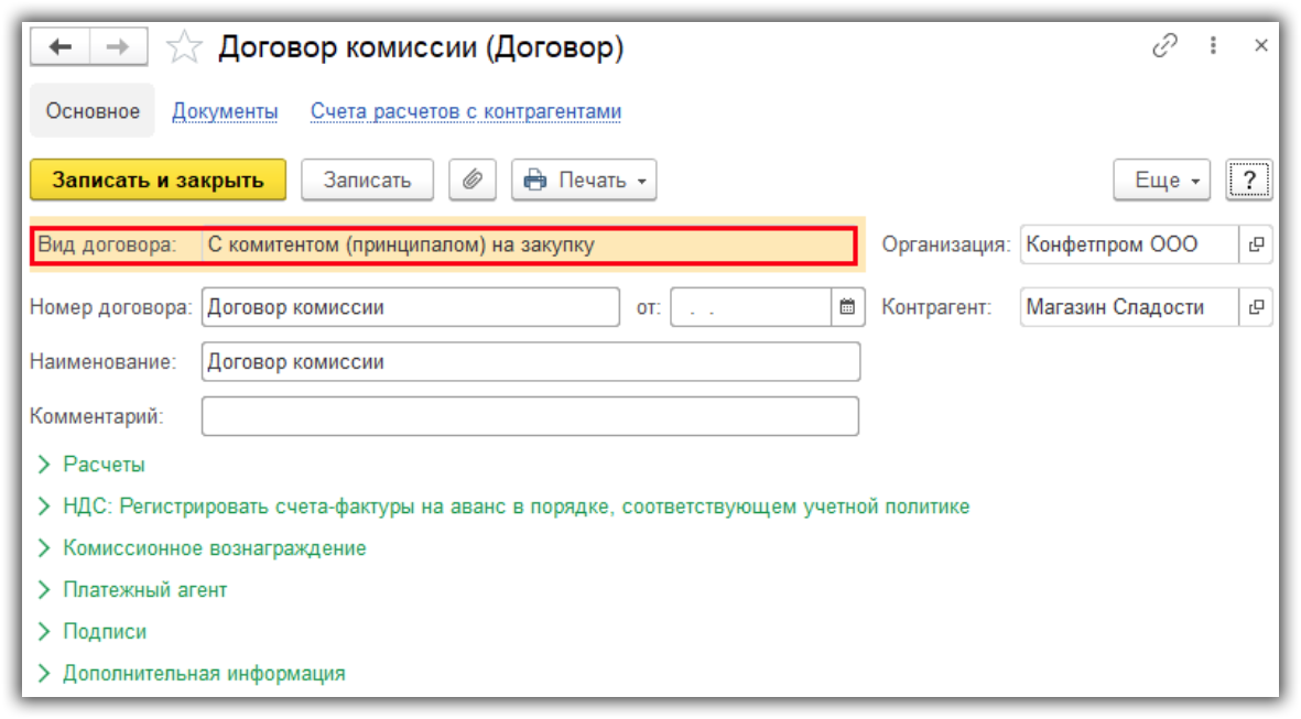 - «Расчеты» (здесь должны быть указаны счета бухучета по взаимным расчетам с комитентом и покупателем).