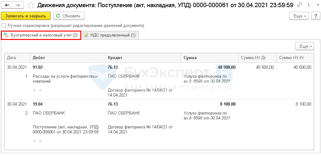 | 30 апреля | 91.02 | 76.13 | 40 500 | 40 500 | 40 500 | Учет затрат на услуги фактора | Поступление (акт, накладная, УПД) — Услуги |