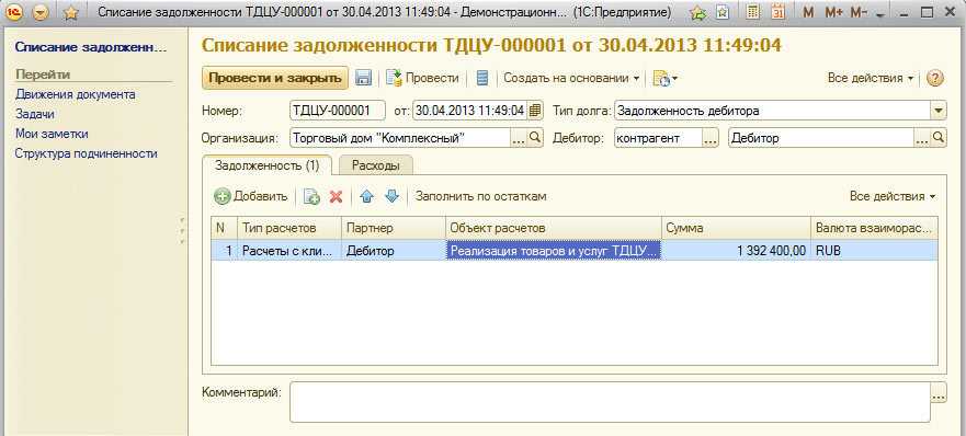После того, как долг был переуступлен банку необходимо отразить списание денежного требования с покупателя на затраты по направлениям деятельности. Чаще всего в бухгалтерском учете это отражается как прочие расходы поставщика. В программе такую операцию необходимо отразить с помощью документа «Списание задолженности» с типом долга «Задолженность дебитора». В качестве дебитора необходимо указать покупателя ООО «Дебитор», документ можно заполнить автоматически по кнопке «Заполнить по остаткам»: