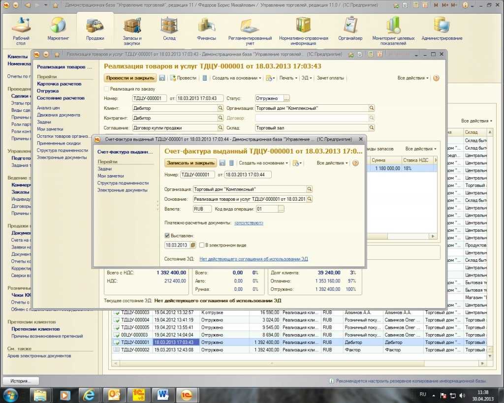 Рассмотрим условный пример. Торговая компания «Торговый дом «Комплексный» продала клиенту ООО «Дебитор» товар на общую сумму 1 392 400 руб. в том числе НДС 212 400 руб. Продажа товаров покупателю (дебитору) осуществляется стандартным образом с помощью документа «Реализация товаров и услуг» на основании которого выставляется счет-фактура выданный.: