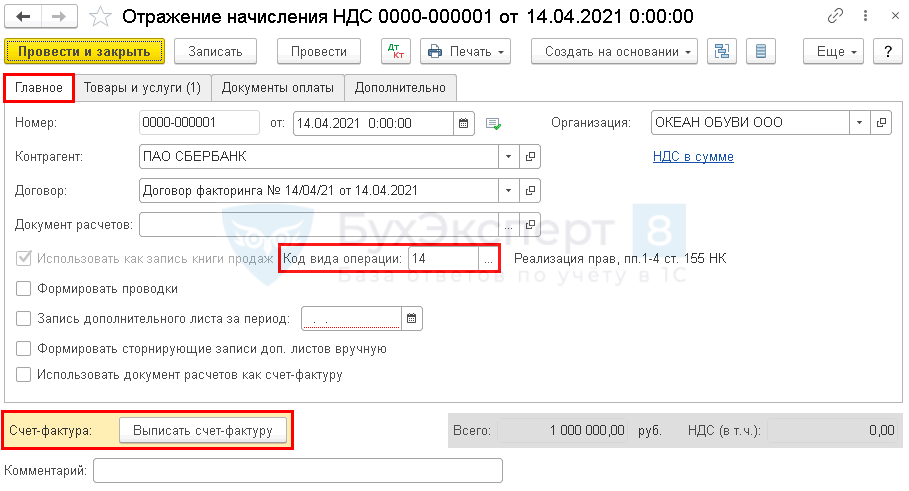На вкладке Главное заполните поля с указанием фактора, договора с ним и укажите Код вида операции — «Реализация прав…».