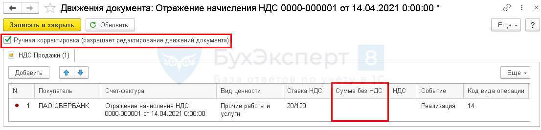 Установите флажок Ручная корректировка (разрешает редактирование движений документа) и в регистре НДС продажи обнулите графу Сумма без НДС.