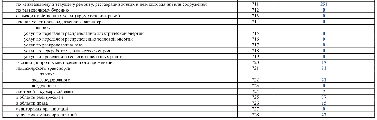 По строке 712 отражают стоимость услуг по бурению (разведка, пробы), а также отбор образцов породы. По строке 713 показывают стоимость сельскохозяйственных услуг по выращиванию культур, защите растений от вредителей и болезней, эксплуатации оросительных и осушительных систем, содержанию животных (кроме ветеринарных) и т. п. Ниже показываем оплату прочих производственных услуг, в которые входит передача и распределение электро-, теплоэнергии и газа, переработка давальческого сырья, проведение геологоразведочных работ (строки 714–719).