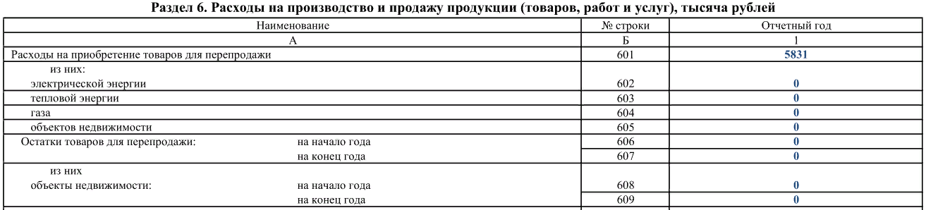 Самый, вероятно, объемный раздел формы 1-Предприятие — разд. 6. В нем отражаются сведения о расходах фирмы на производство и реализацию продукции, услуг и работ, а также сопутствующих им показателях (таких как, например, остатки закупленных ТМЦ).