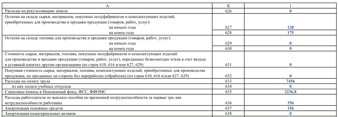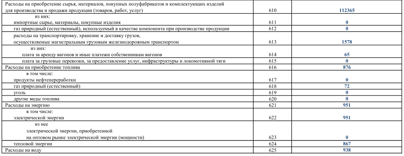 Далее показываем расходы, которые понесли в связи с приобретением сырья (материалов, полуфабрикатов, запчастей) для производства своей продукции и ее продажи (строки 610–615). По строкам 616–625 отражаем стоимость топлива, газа, электро- и теплоэнергии, а также воды для нужд организации. В строке 626 показывают расходы на предотвращение деградации, восстановление плодородия земель, устранение загрязнений почвы и т. п.